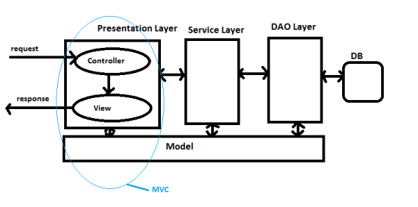 - If business logic required to the particular request it will call the appropriate Service class to process the request. Based on the service object response, controller redirects to the appropriate view.