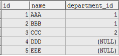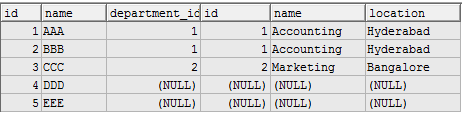 Here department_id is the foreign key to Department table, Department 3 doesn’t have any employees associated with it. And Employees 4,5 are not associated with any Department.
